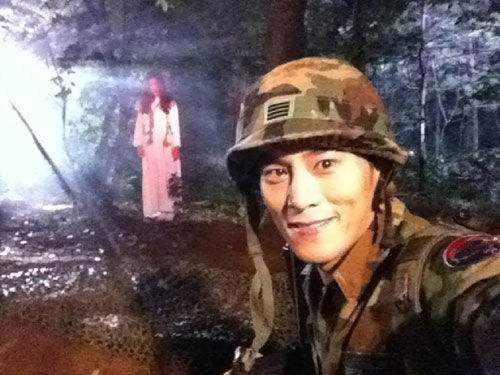김재우는 최근 자신의 미투데이(http://me2day.net/jwswlolo)에 tvN '롤러코스터 2(이하 롤코 2)' '푸른거탑' 촬영 중간에 짬을 내어 찍은 셀카를 공개했다. 이 사진에는 늦은 밤 숲 속에서 전투복을 입고 환하게 미소 짓는 모습 너머로 소복을 입은 여성이 서 있어 보는 이들의 등골을 오싹하게 만든다.