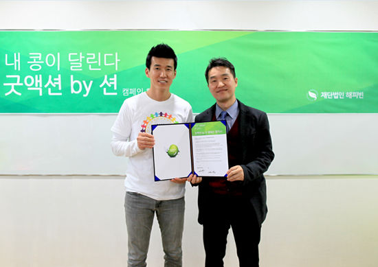 [SBS연예뉴스 | 이정아 기자]'선행천사' 션과 재단법인 해피빈이 온라인 기부 문화 확산을 위해 '내 콩이 달린다! 굿액션 by 션' 캠페인 협약식을 가졌다.